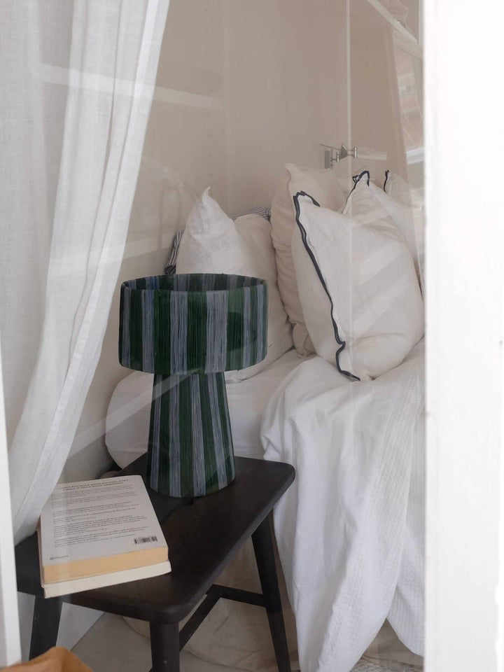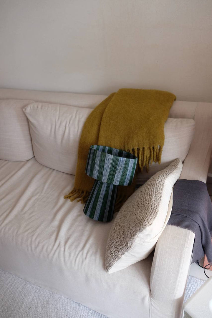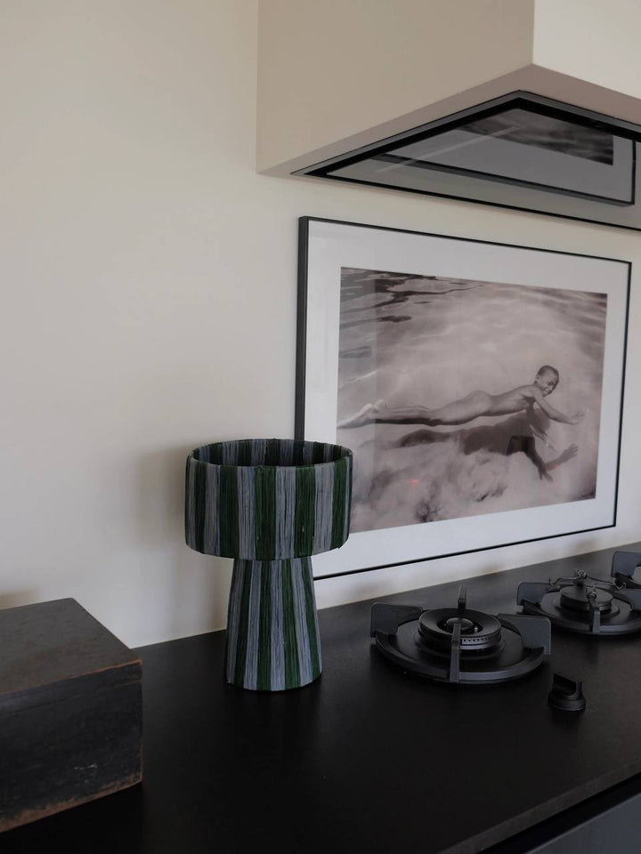 - Design: Striped green and gray pattern with a sculptural, contemporary shape