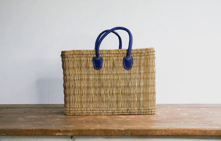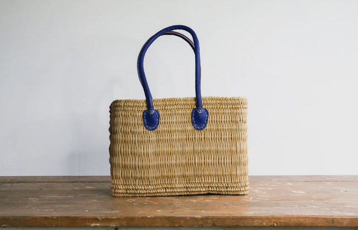 Handmade Moroccan Rattan Basket Bag – Small / Medium / Large – Blue Navy Handles (Short or Long)
